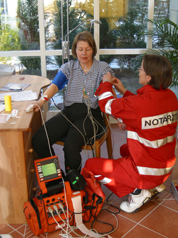 Als es klingelt, verwandle ich mich wieder in die Patientin. Die zwei Männer vom Rettungswagen kommen direkt auf mich zu, einer trägt einen großen Koffer. Noch während sie sich vorstellen, beginnen Sie schon mit den notwendigen Maßnahmen: um meinen rechten Oberarm kommt die Manschette, um den Blutdruck zu überprüfen; an den rechten Finger wird  der „Fingerhut“ geklemmt, eine elektronische Vorrichtung, um den Sättigungsgehalt des Sauerstoffs im Blut zu kontrollieren; um meine Atemnot zu verringern, wird mir eine „Nasenbrille“ angelegt. Das ist ein kleiner Schlauch, der die Luft direkt in die Nase leitet – nicht gerade angenehm, diese Halterung um den Kopf.